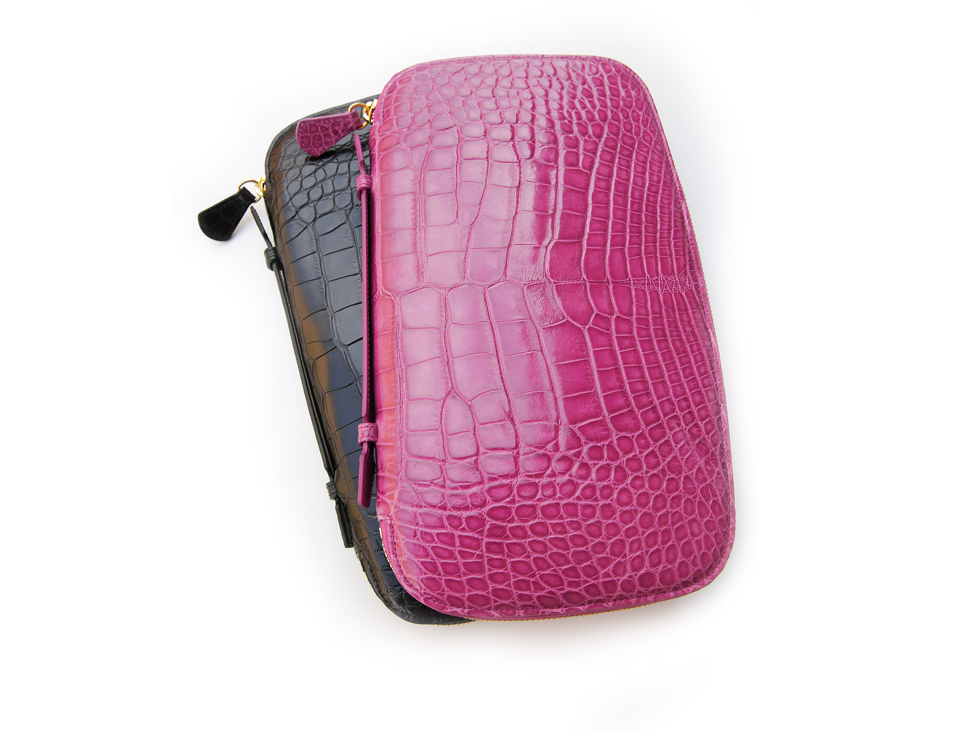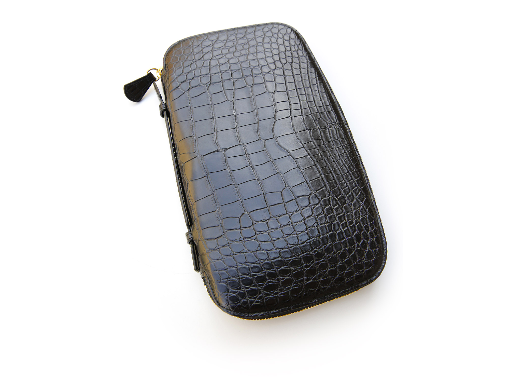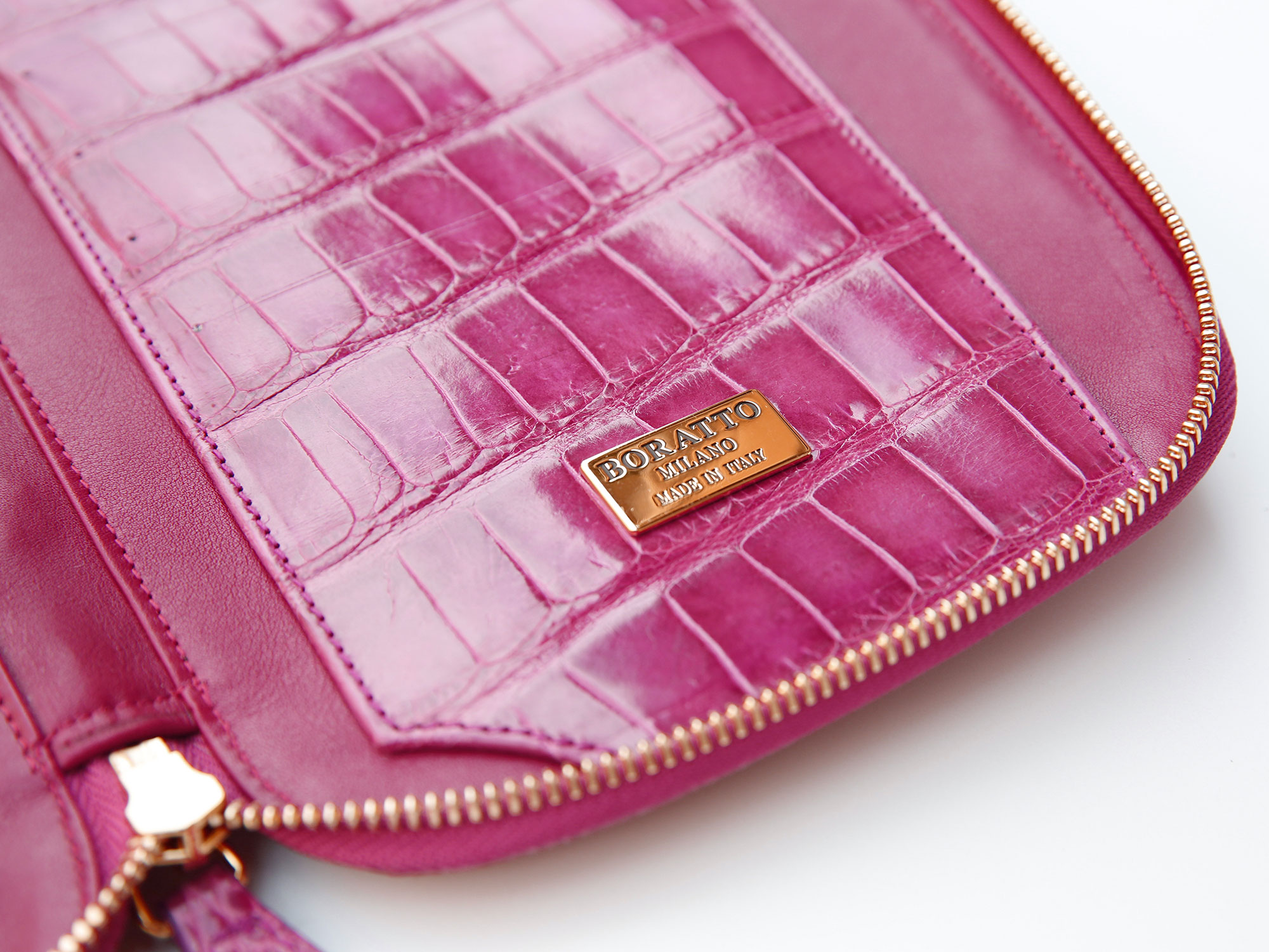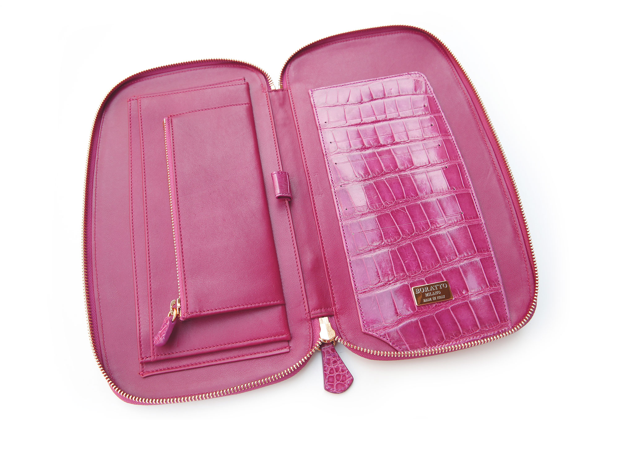 Genuine alligator exterior, supple calfskin and alligator interior, five card slots, a pen holder, two multi-use compartments, central zip pouch. Fine gold hardware including raised Boratto logo on interior only.