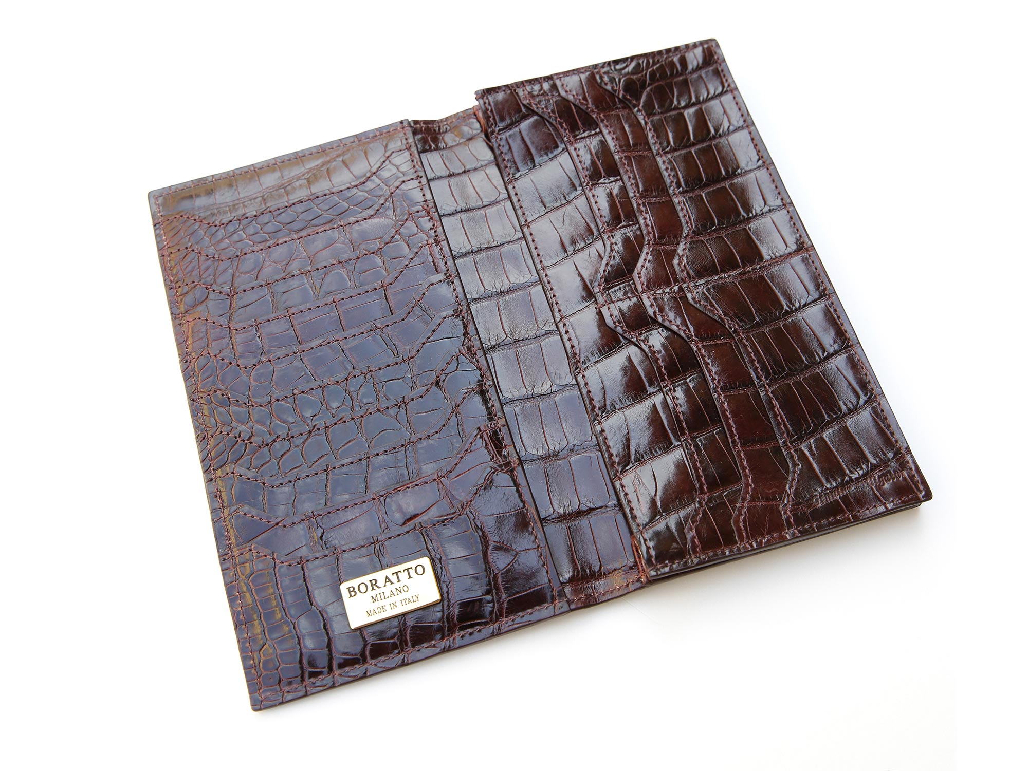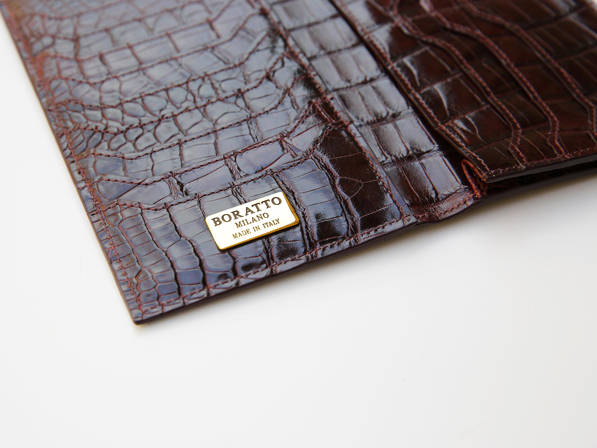 The ultimate wallet with sleek and timeless appeal. Simple functionality and excellent craftsmanship makes this a worthy investment for years to come. Our TASCONE bifold wallets are individually handcrafted using the finest Alligator skins for the interior and exterior. Each TASCONE is designed with sixteen card slots, one bill sleeve on the left side and two slip compartments on the right side. Raised gold tone Boratto logo located on the interior. Comes in a selection of rich and alluring colors.